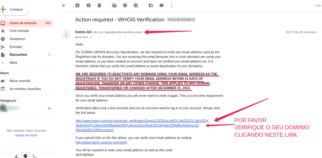Solicitamos que se receber este email, verifique o seu email clicando no link que se encontra no corpo do email enviado pelo ICANN.